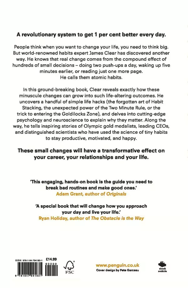 Mark Manson, author of The Subtle Art of Not Giving A F*ck, praises the book for its practicality. James Clear is a world-renowned habits expert who has discovered a simpler system for transforming lives. He believes that lasting change comes from the compound effect of hundreds of small decisions or 'atomic habits.' Clear explains how these tiny changes can help individuals get 1% better every day, and he uncovers a handful of simple life hacks such as the forgotten art of Habit Stacking, the Two Minute Rule, and the Goldilocks Zone. Along the way, he delves into cutting-edge psychology and neuroscience to explain why these small changes matter.